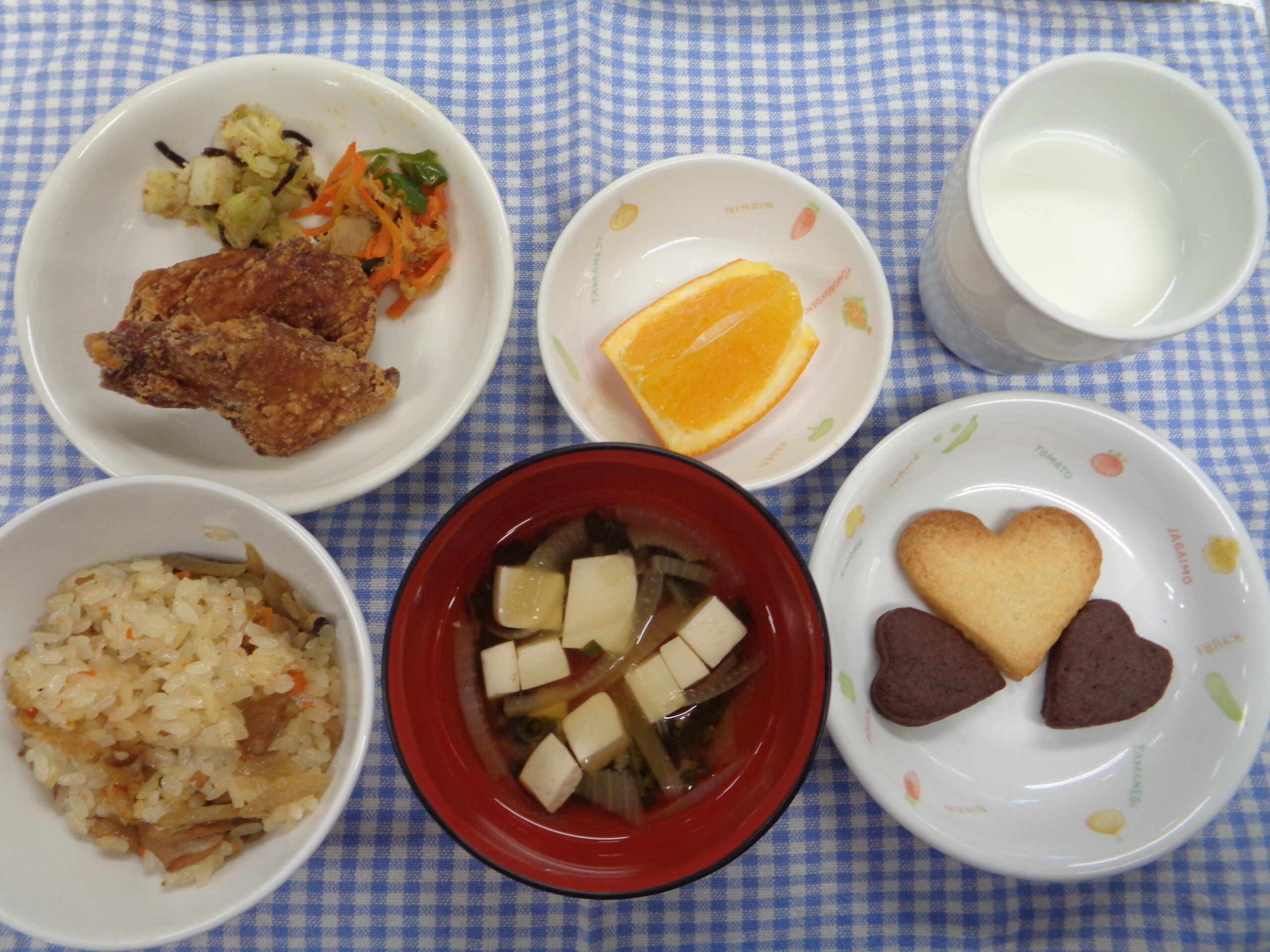 釜炊き五目おこわ大人気でした!明日はバレンタインデー♥今日のおやつは1日早いバレンタインのハートクッキーです♥