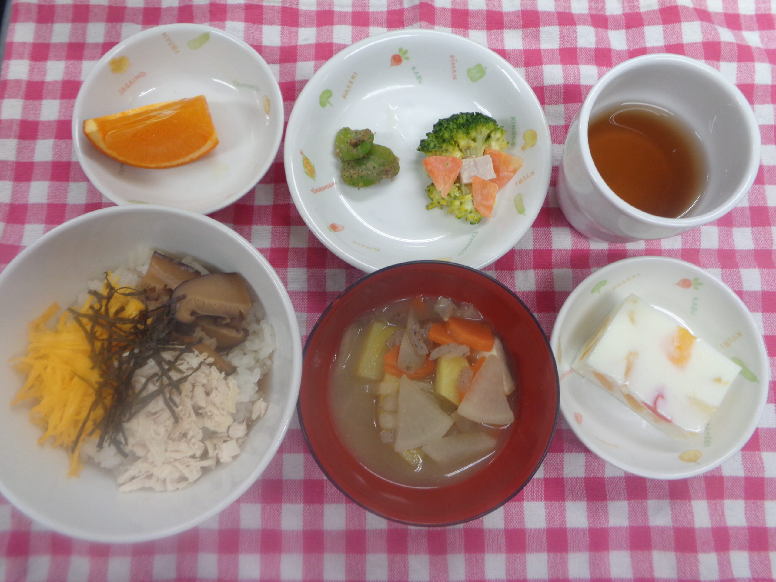 今日の給食は鹿児島県の郷土料理でした。鶏飯はごはんにゆでてほぐしたささみ、甘じょっぱく煮た干し椎茸、錦糸玉子をのせてささみの茹で汁、干し椎茸の戻し汁で作った汁をかけて食べます。
