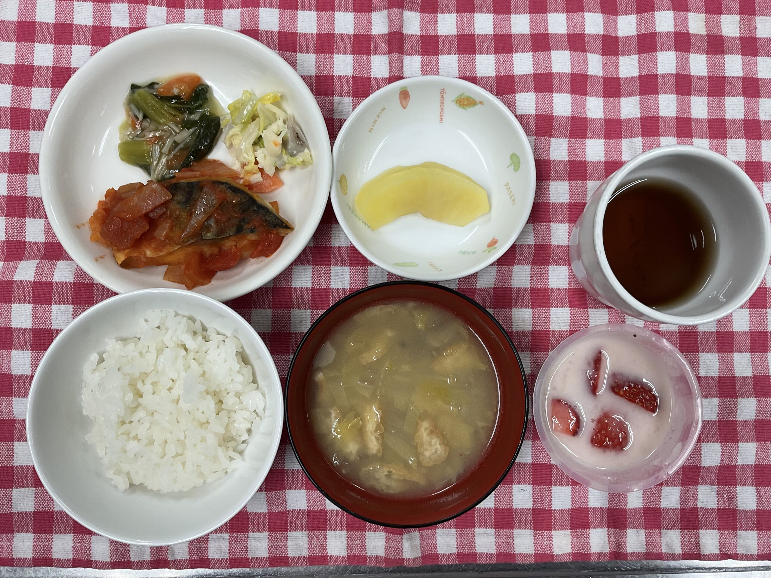 今日は鯖のトマト煮、ちんげん菜のとろみ炒めが新メニューでした♪