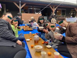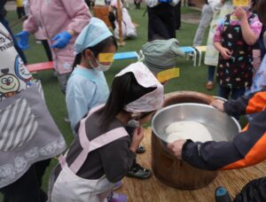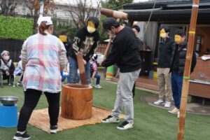 朝から庭で大きな釜に湯を入れて、雑煮用の汁と餅つき用の米を蒸かして作りましたよ。年長さんのお父さん達が餅を搗き、お母さん達は返しの体験をして、2歳児から5歳児までは雑煮用の野菜ちぎりをしてみんなで餅つきをもりあげました♪
